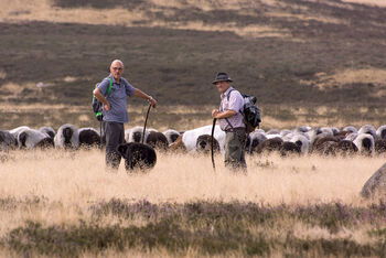 Seine Schnucken sind inzwischen auf ein Stück Grasland weitergezogen. Hier fressen sie ausgiebig....