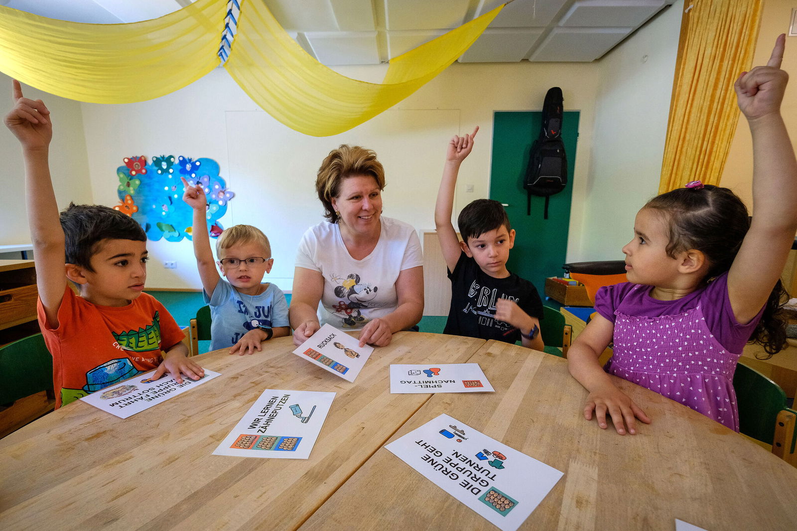 Der fünfjährige Ilias hebt aufgeregt den Finger und plappert los: "Wir haben Pferde, Schweine und Esel gesehen und Eis gegessen." Neben ihm sitzt Erzieherin Anke Aust am Tisch und ermuntert eine Gruppe von Kindern durch weitere Nachfragen, über einen kürzlichen Tagesausflug zu erzählen. "Nein, zum Mittagessen gab es Hot Dogs", korrigiert der sechsjährige Josef seinen Spielkameraden. Vor den Kindern liegen ausgebreitet mehrere Karten mit unterschiedlichen Symbolen, die neue Anregungen für Gesprächstoff geben. In der evangelischen Kindertagesstätte St.-Thomas in Hildesheim gehören Sprachförderung und Sprachbildung schon lange zum Alltag.