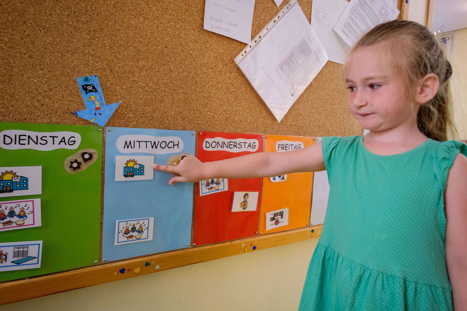 Die Erzieher in der Hildesheimer Kita beschäftigen sich schon seit Jahren mit der Sprachförderung und damit, wie sie diese am besten in den Alltag integrieren können. Im Konferenzraum hängen von einer kürzlichen Präsentation noch kleine Zettel, die darauf hinweisen, wie wichtig eine deutliche Aussprache oder der Blickkontakt zum Gesprächspartner ist. In fast jedem Raum finden die Kinder Bilder, die sie zum Gespräch animieren. Ein Foto im Eingangsbereich zeigt den Kindern, was es zum Mittagessen geben wird: An diesem Tag ist es Pfannkuchen mit Apfelmus, wie die vierjährige Nahla erklärt.
