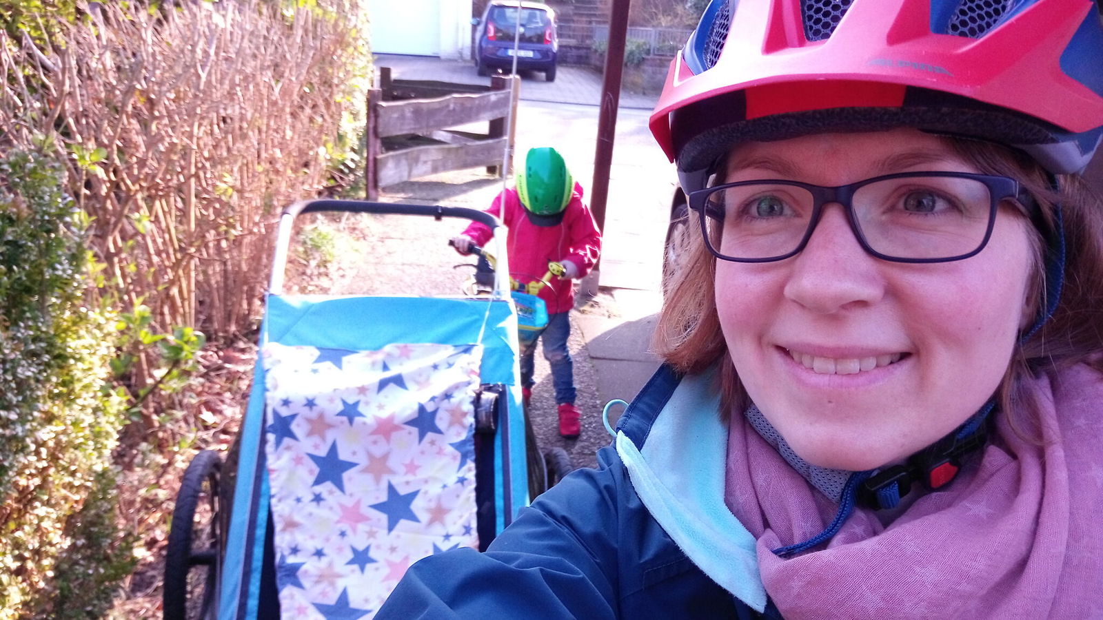 Heute hatte Lene Schwimmkurs. Die letzten Wochen sind wir mit dem Auto gefahren, meist aus Zeitgründen. Außerdem ist Freitag, alle sind kaputt von der Woche, danach will ich schnell nach Haus. Heute sind wir mit dem Fahrrad gefahren! Wir brauchen 25 Minuten, aber die Sonne scheint und wir schaffen es – und sind stolz, als wir schließlich wieder zuhause sind.