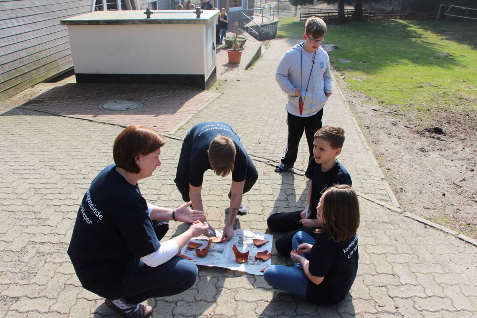 Danach gingen wir raus und ließen dort kleine Blumentöpfe auf den Boden fallen, sodass sie in einige kleine Teile auseinander brachen. In die Blumentöpfe schrieben wir innen Dinge hinein, die Gottes Schöpfung weiter zerstört. Danach klebten wir die Scherben wieder zu einem Blumentopf zusammen und schrieben außer darauf, was wir Menschen tun können, um die Schöpfung zu bewahren. Damit wollen wir symbolisch die zerstörte Schöpfung wieder reparieren. Und bei dieser Aufgabe hatte jede und jeder eine eigene Idee, sodass die Blumentöpfe außen schnell mit Ideen übersät waren.