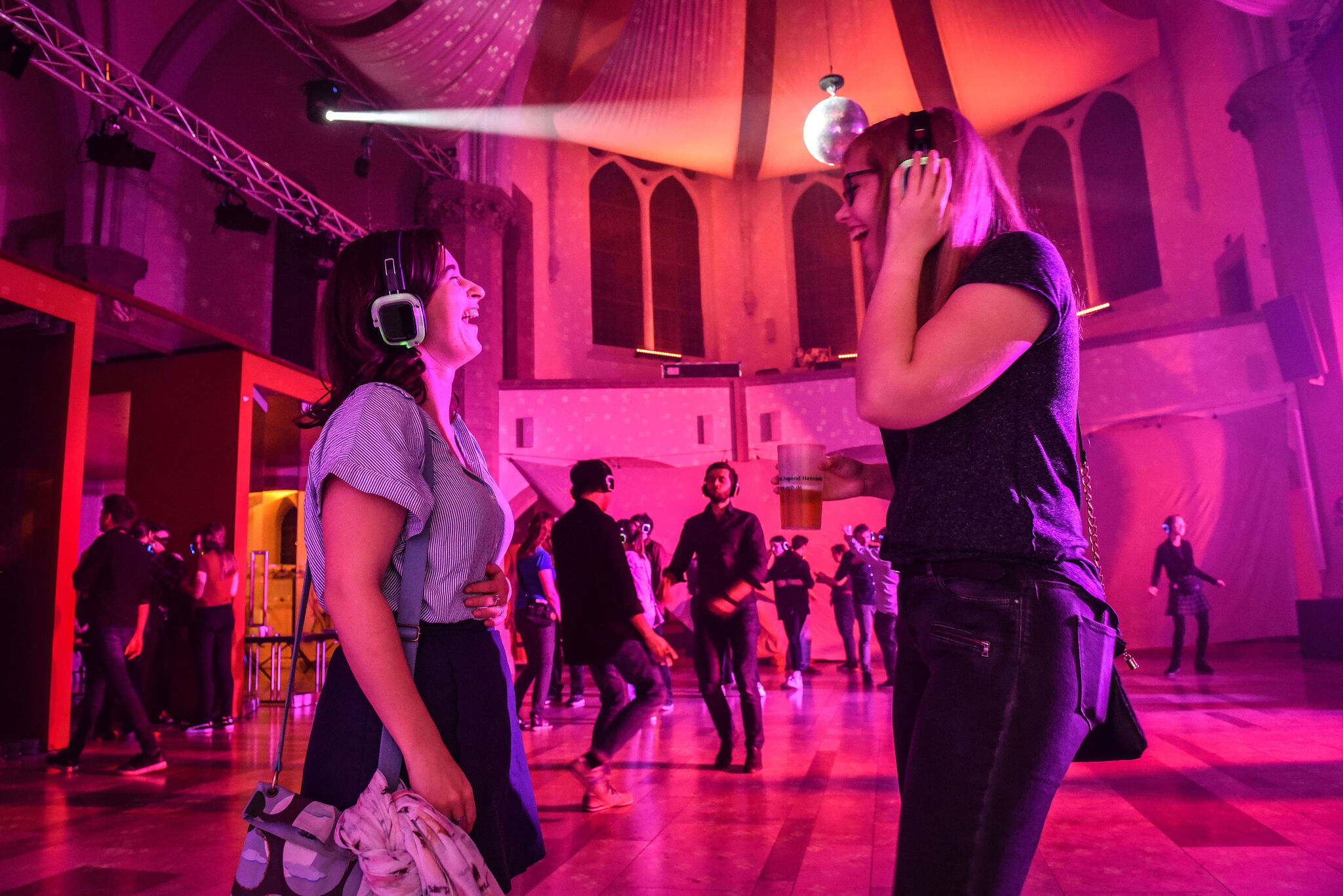 Das passiert hier doch. Die Kopfhörer zeigen mit farbigem Licht an, bei wem welche läuft, da können Leute zusammen tanzen, müssen aber nicht. Eigentlich ist es so, dass hier sogar Menschen zusammen tanzen, die das sonst gar nicht tun würden. Jeder kann die Musikrichtung hören, die er sonst in seinem Club hört, kann aber mit Freunden herkommen, die ganz andere Musik mögen.