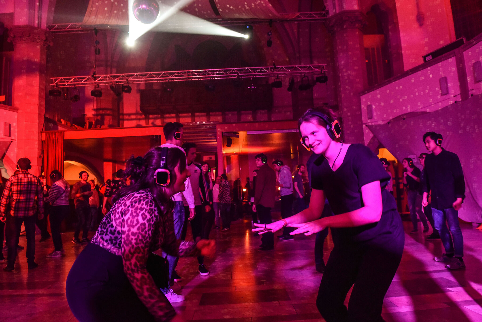 Jeder Besucher trägt einen Kopfhörer und kann zwischen drei DJs mit verschiedenen Musikrichtungen auswählen. Aber ist es nicht irgendwie Sinn einer Party, gemeinsam zu tanzen?