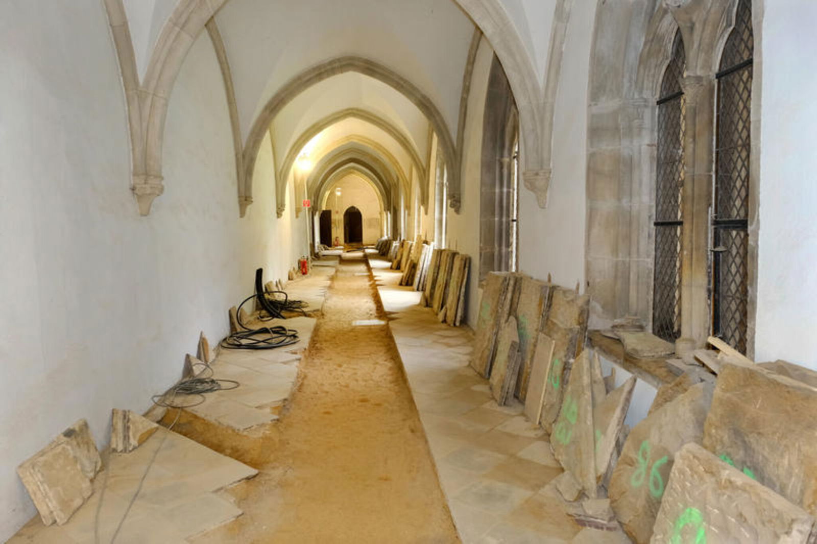 Sogar der Boden des mittelalterlichen Kreuzgangs ist aufgerissen. "Hier soll einmal die elektrische Versorgung entlanglaufen", sagt der Ingenieur und Projektleiter Oliver Wolf, während er mit Schutzhelm und Arbeitsschuhen über Sand und Steine steigt. Damit der Kreuzgang nach dem Verlegen der Kabel wieder aussieht wie vorher, haben Handwerker die Bodenplatten auf der Unterseite grün durchnummeriert. Noch bis 2020 läuft im Kloster Loccum zwischen Weser und Steinhuder Meer das größte Bauprojekt der hannoverschen Landeskirche in der Nachkriegszeit: Für mehr als 29 Millionen Euro wird die historische Anlage komplett durchsaniert und modernisiert.