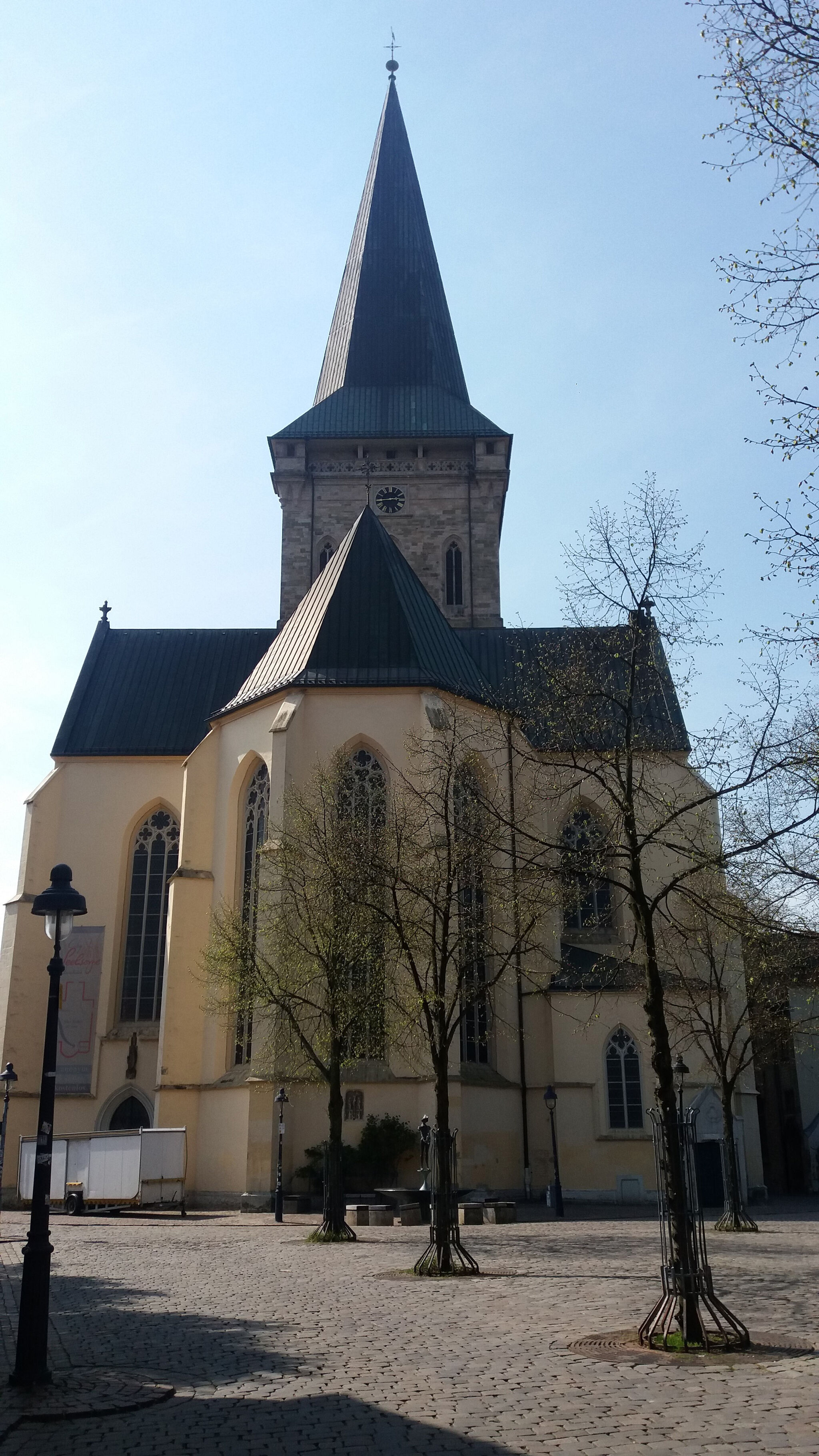 Osnabrück.Die St.-Katharinen-Kirche ist eine spätgotische dreischiffige westfälische Hallenkirche, deren Ursprung im 13. Jahrhundert liegt. Ihr Name ist zurückzuführen auf den Katharinenkult, der von den Teilnehmern des 3. Kreuzzugs unter Friedrich Barbarossa aus dem Heiligen Land mitgebracht wurde. Ihr Innenraum ist geprägt durch die schlanken hohen Fenster und die mächtigen aufstrebenden Bündelpfeiler, die die – für Hallenkirchen typisch – gleich hohen Mittel- und Seitenschiffe trennen.