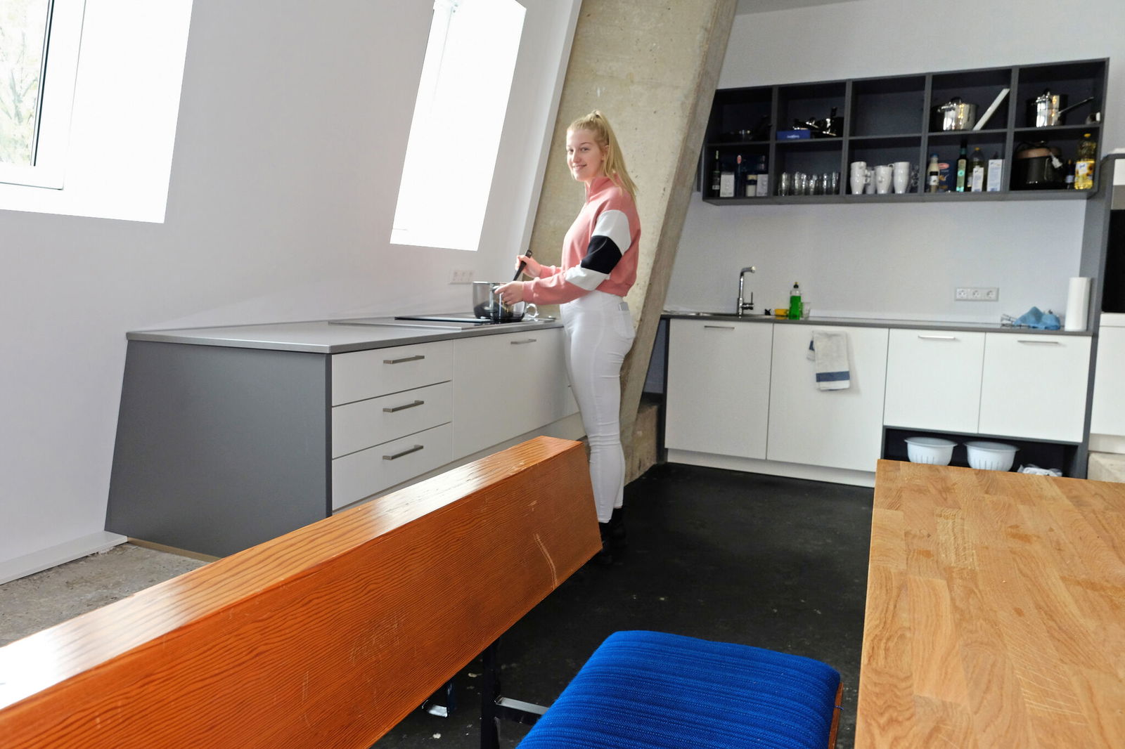 Unter ihren Zimmernachbarn sind Studierende aus aller Welt, aus dem Iran, aus China oder aus Polen. Karolina gefällt das: "Gegenüber von mir wohnen Peruanerinnen, die sind total lieb. Man lächelt miteinander, man quatscht ein bisschen. Englisch funktioniert." Beliebte Treffpunkte für alle sind die beiden Gemeinschaftsküchen. "Wir haben schon ein paar Abende zusammengesessen, Spiele gespielt, zusammen Bier getrunken und viel gelacht." 390 Euro Warmmiete zahlt sie pro Monat für ihr Einzelzimmer mit Duschbad und WLAN - die Preise orientieren sich an denen des Studentenwerks.