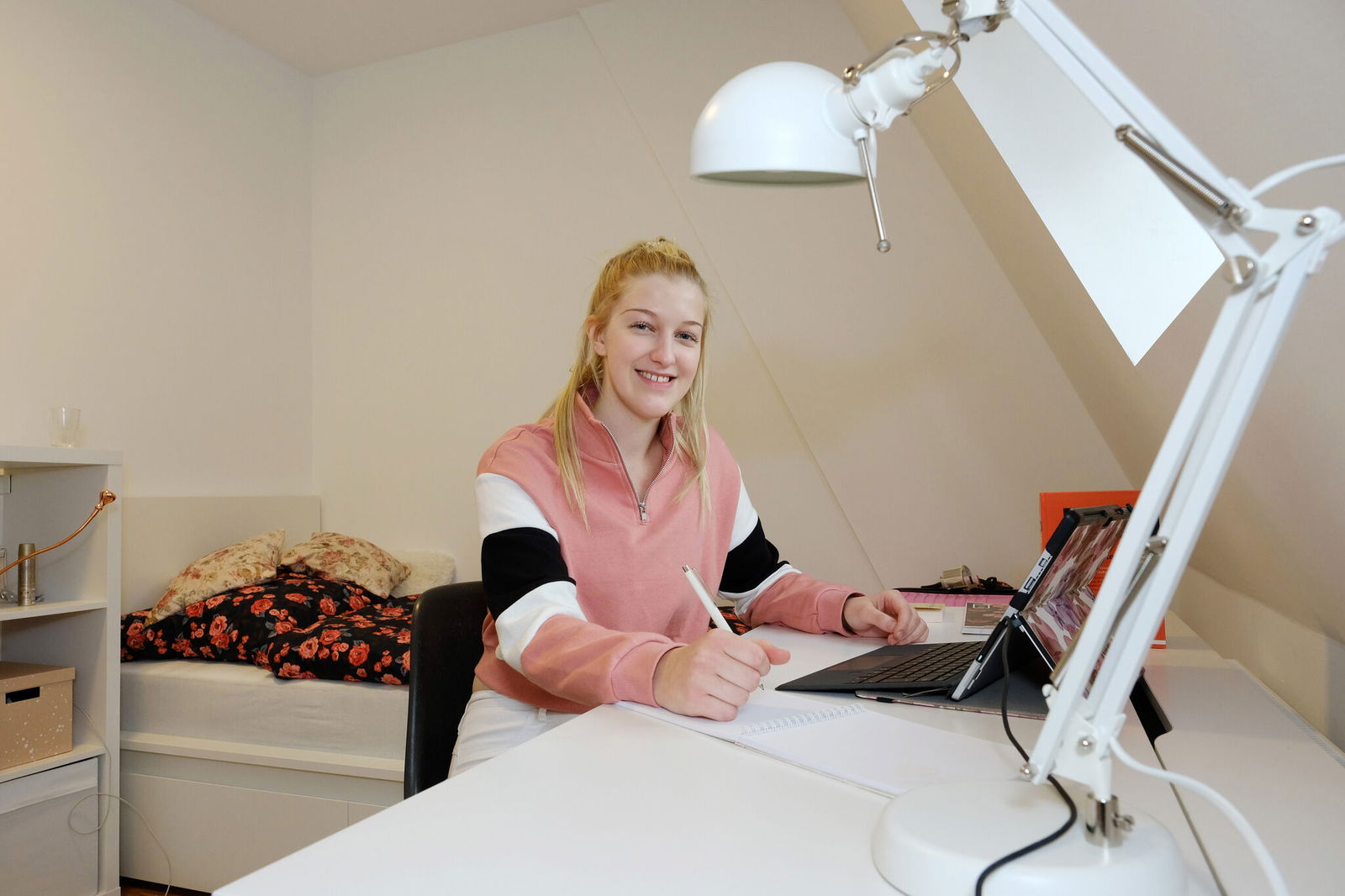 Karolina Sacher (20) aus Aurich ist schon Ende September eingezogen und fühlt sich pudelwohl. "Es ist schon sehr besonders", erzählt sie. "Wenn man die Kirche betritt, fühlt man, dass es kein normales Studentenwohnheim ist. Es gibt gleich eine Gemeinschaft hier." Ihr Zimmer im ersten Stock hat Karolina schon gemütlich eingerichtet. Auf dem weißen Schreibtisch hat sie für ihr beginnendes Journalistik-Studium den Tablet-Computer aufgeklappt, daneben steht griffbereit ein Duden. Pinkfarbene Rosen schmücken den Raum. In einem Korb im Regal bewahrt sie Öl und Salz auf. "Ich fühle mich heimisch hier."