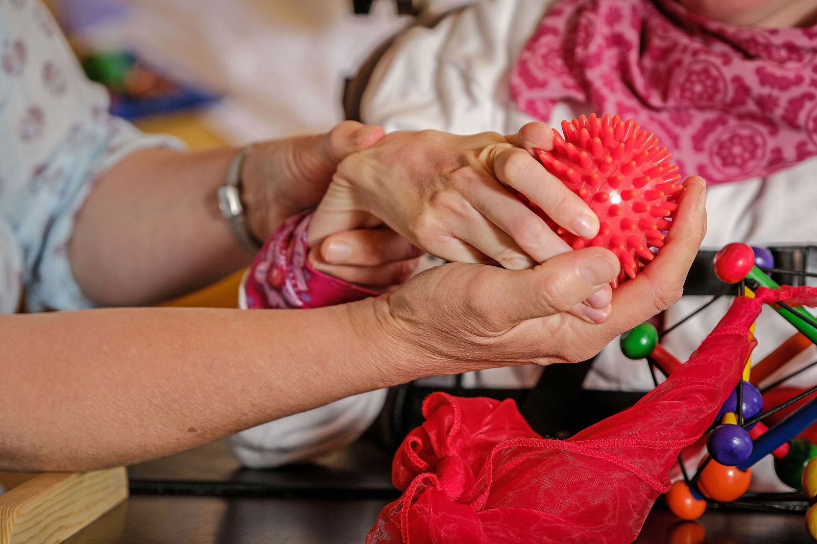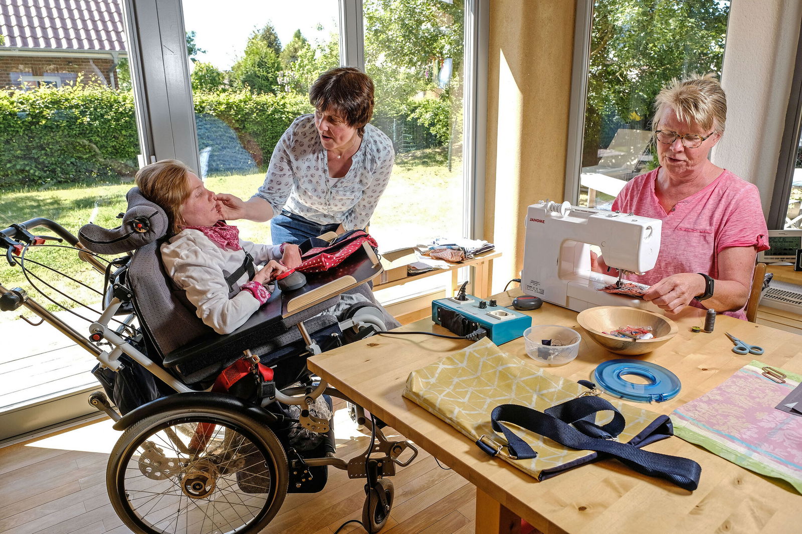 Fest angeschnallt sitzt Clara Akkermann in ihrem Spezialrollstuhl, die wachen Augen streunen umher. Die zierliche Hand der 20-Jährigen liegt auf einem roten Igelball, den ihre Mutter festhält. Ein Tuch aus rotem Tüll und ein Spielzeug aus bunten Holzperlen und Stäben hat Clara vor sich auf dem Tisch. "In den Ferien beschäftigen wir uns zu Hause mit Clara", sagt Almut Akkermann (52) und blickt ihre Tochter liebevoll an. "Auch in die Küche und in den Garten nehmen wir sie mit." Clara ist körperlich und geistig schwerstbehindert.