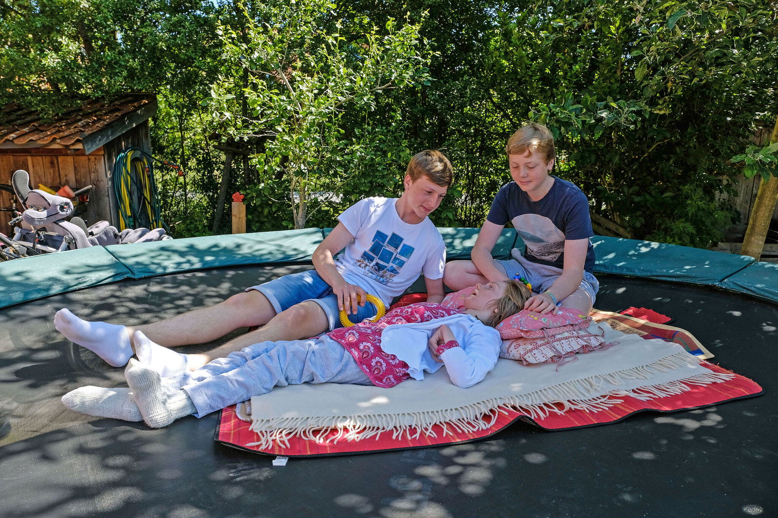 Spätestens Anfang nächsten Jahres soll alles zum Einzug der ersten Bewohner fertig sein. Bis dahin genießen die Akkermanns die schönen Stunden mit Clara. Josia und Jaron kuscheln mit ihr auf der Liegelandschaft im Wohnzimmer oder nehmen sie mit in den Garten. Im Schatten der Büsche und Bäume schaukeln sie mit ihr sanft auf dem großen Trampolin. Lang ausgestreckt liegt Clara auf warmen Decken. Ihren Kopf haben die Brüder auf ein Kissen gebettet. Claras wache Augen ruhen auf Jarons Gesicht.