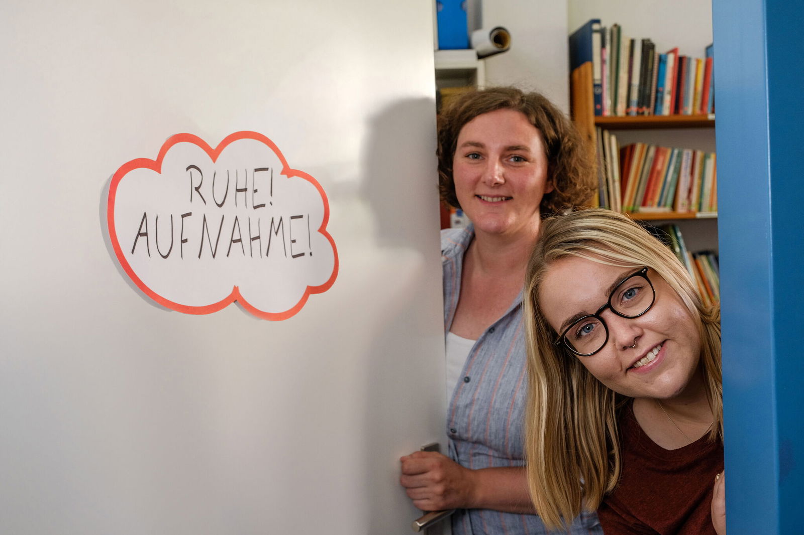 Die Vorfreude auf ihren Podcast ist beiden anzumerken, als sie probeweise ein kleines Mischpult mit Kopfhörern und Mikrofon verbinden und ein Schild an die Tür hängen, auf dem „Ruhe! Aufnahme!“ steht. „Wir werden die Aufnahme hier erstmal in der kleinen Bücherei des Jugenddienstes Hildesheim versuchen – es ist ein ruhiger Raum und die Bücher sollten gut dämmen“, sagt Elske Gödeke. Neben der Technik liegen noch ein paar Notizzettel und ein Laptop – viel mehr brauchen die beiden nicht. „Die Fragen werden online anonym über Tellonym gestellt“, sagt Julia Grote, „anhand der Wortwahl und der Ausdrucksweise kann man zwar grob auf das ungefähre Alter schließen – wir haben zum Beispiel schon eine Frage bekommen, bei der wir ziemlich sicher sind, dass sie kein Teenager formuliert hat – aber letztlich wissen wir nicht, von wem die Fragen kommen.“