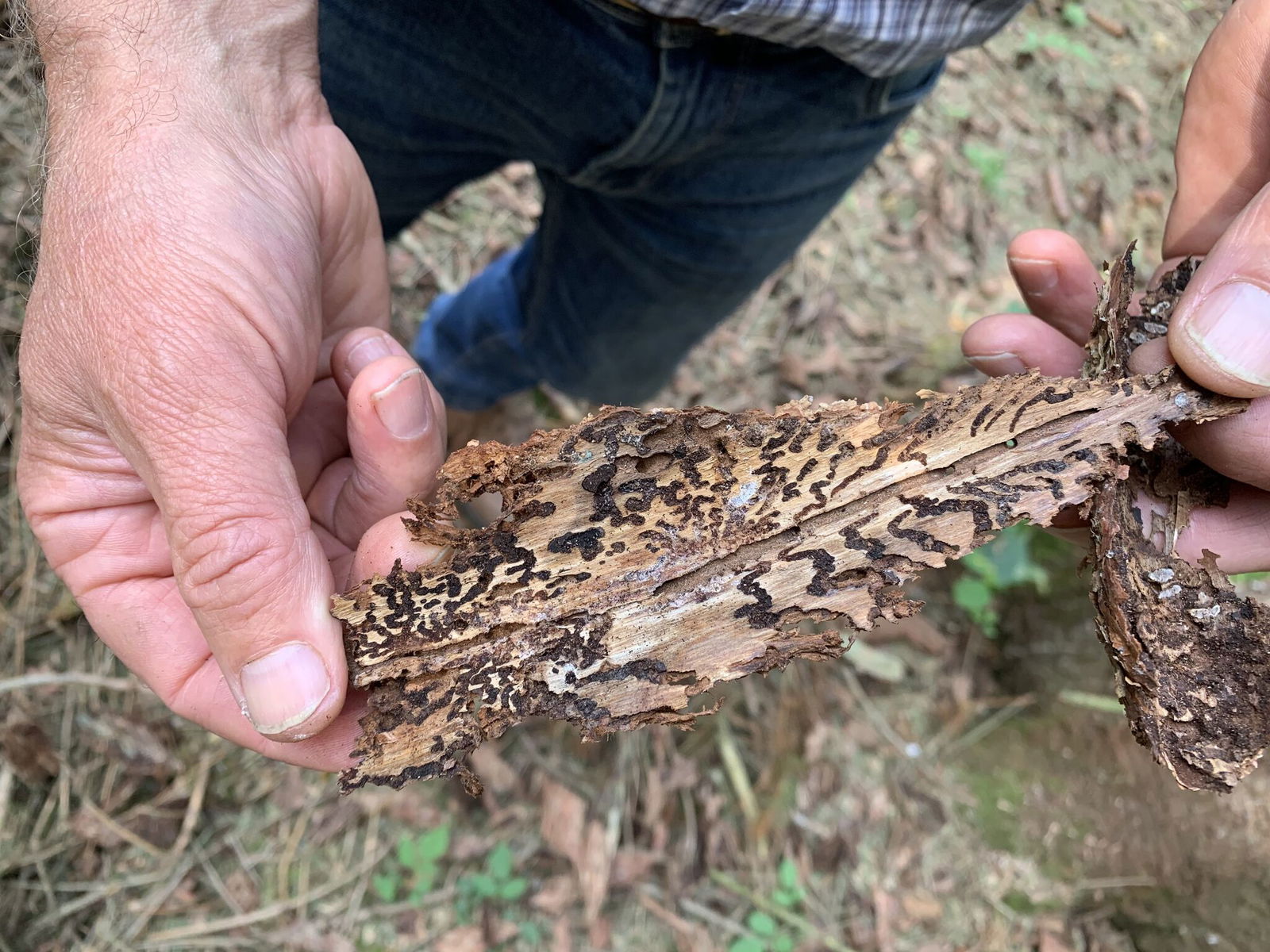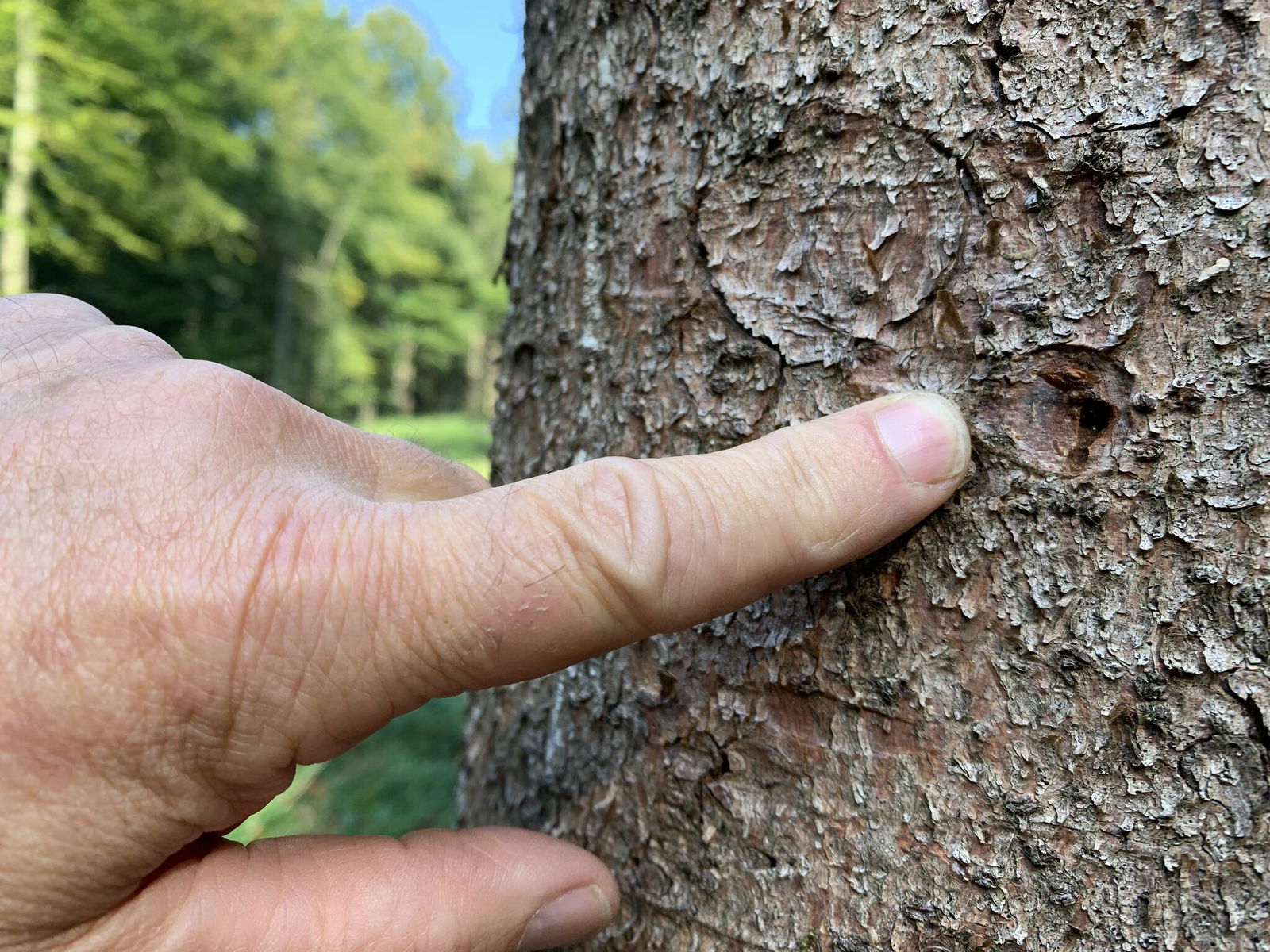 Wer „den Käfer“ finden will, muss auf den Boden schauen. Tatsächlich ist dieser grün. Grün vor lauter Nadeln, augenscheinlich lebendig und doch sind die Nadeln Boten eines sterbenden Baums. „Das ist ein typisches Zeichen für den Buchdrucker.“ Buchdrucker und Kupferstecher, ein unheilvolles Duo, dessen feingeistige Namen hinwegtäuschen über ihr tödliches Tun.