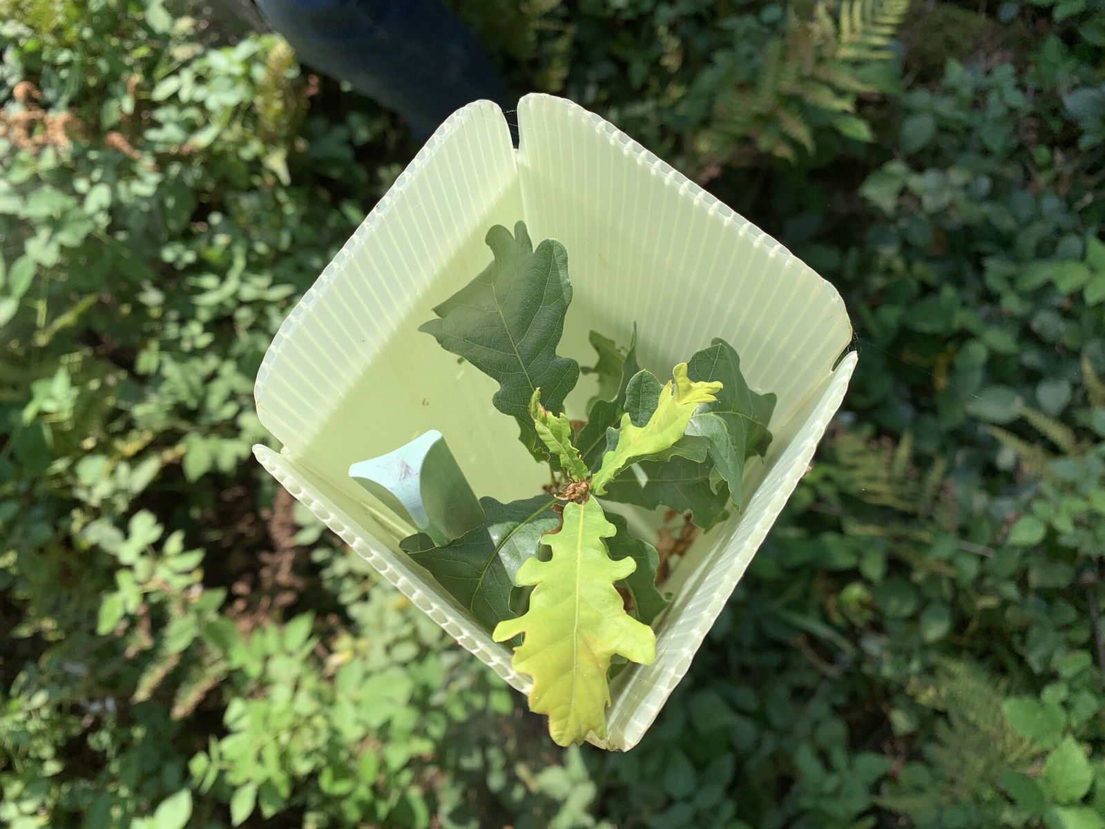 Für den Laien durchaus verstörend, für den Profi indessen beruhigend wirken etwa ein Meter hohe, sehr schlanke Plastikpakete, die Zahnstocher-gleich in bleichem Weiß aus dem Waldboden ragen. „Das sind Pflanzhilfen, die zum einen gegen den Wildverbiss schützen und zum anderen ein sehr gutes Klima für die Jungpflanze bieten.“ Kurze Pause. „Ja, und natürlich sind sie wiederverwertbar!“ Tatsächlich überragen die darin wachsenden Eichen ihre Altersgenossen in den sonst üblichen Wildschutzzäunen um einen guten halben Meter.