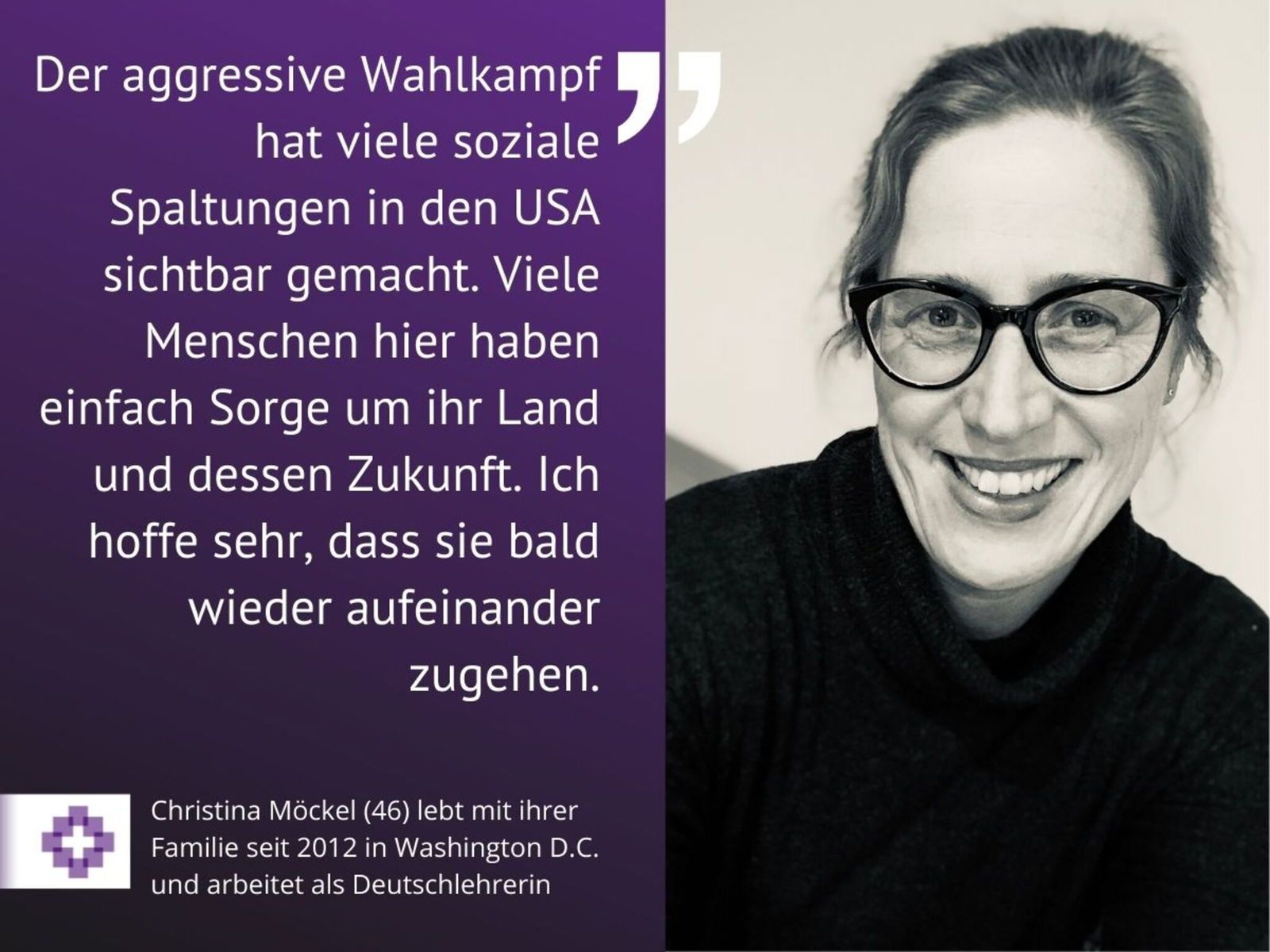 Christina Möckel (46) lebt mit ihrer Familie seit 2012 in Washington D.C. und arbeitet als Deutschlehrerin an einer Universität - wegen der Corona-Pandemie seit März nur im Home Office. Im Video-Interview am Tag nach der Wahl hat sie erzählt, dass auch die Mitglieder der deutschen evangelischen Kirchengemeinde, in der sie Gemeinderätin ist, seit Monaten nur über Videokonferenzen Gottesdienst feiern. Und dass die Unsicherheit über den Ausgang der Präsidentschaftswahl kaum auszuhalten ist.