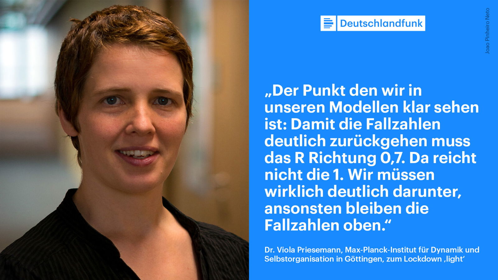 Viola Priesemanns Berechnungen lassen seelsorgerliche Fragen unbeantwortet. Die Bedingungen des sogenannten Lockdown light mit Beschränkungen etwa in der Kultur, bei Hotels und Gaststätten bewerten die Göttinger Forscherin und ihr Team allerdings als nicht ausreichend. "Diese Maßnahmen verpuffen. Das ist jetzt eine Frage von ganz oder gar nicht. Wenn wir die Schraube nicht konsequent anziehen, werden die Fallzahlen wahrscheinlich nicht sinken. Dann muss man sich fragen, wie lange man die derzeitigen Einschränkungen beibehalten will."