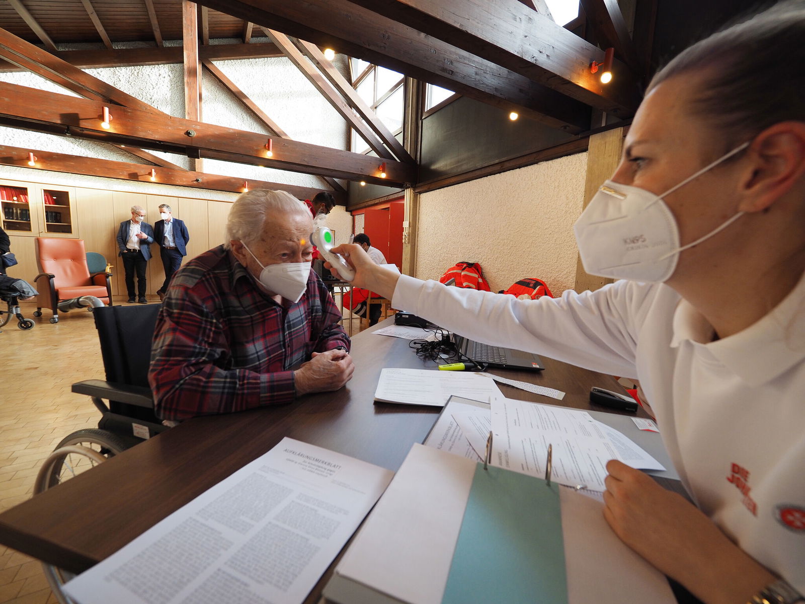Wedemeyer: „Zuerst müssen sich die Patient*innen anmelden und einen Fragebogen ausfüllen: Gibt es Vorerkrankungen, Allergien, oder ähnliches? Der wird im nächsten Schritt mit einem Arzt oder einer Ärztin durchgesprochen. Im Probelauf hat sich gezeigt, dass wir dafür mehr Zeit benötigen, als im Vorhinein veranschlagt. Manche sagen: ,Ich bin gesund, gebt mir einfach die Impfung‘, aber manche haben noch viele Fragen, zum Beispiel zur Wirksamkeit oder möglichen Ansteckungen. Das ist ja verständlich. Wenn dann alles passt, wird geimpft. Für den Fall, dass allergische Reaktionen auftreten, bleiben die Patient*innen noch 15 Minuten vor Ort.“