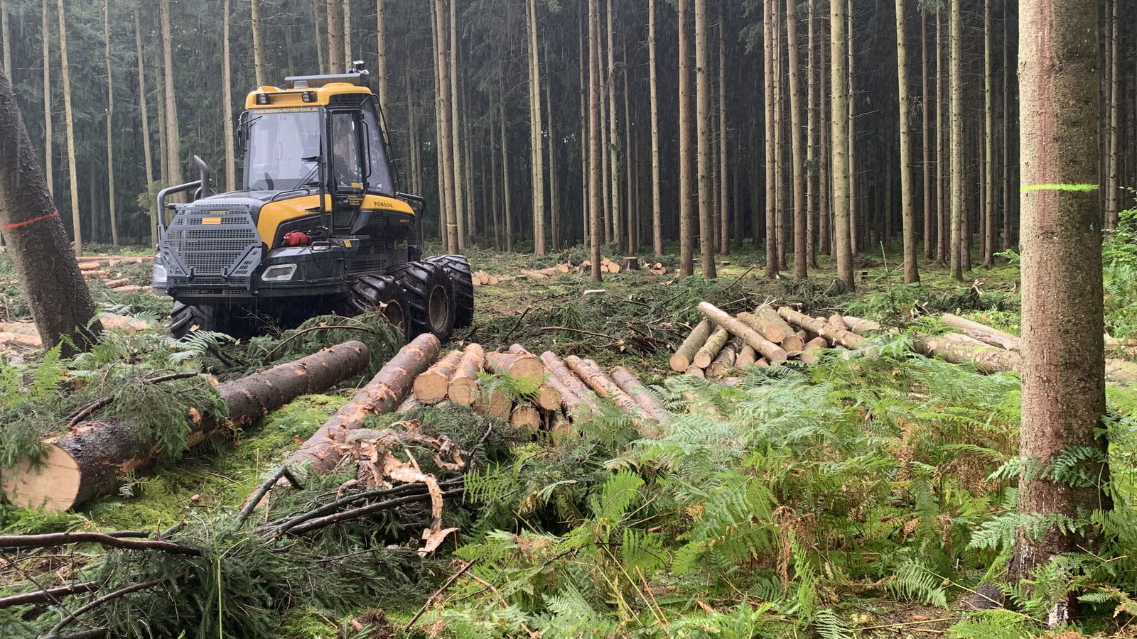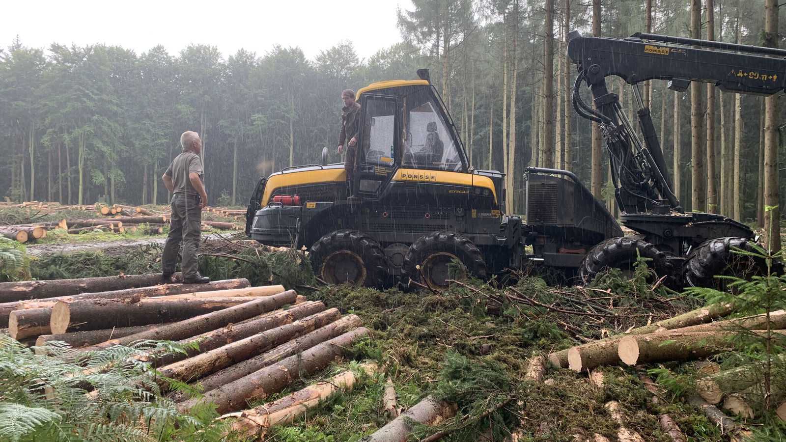 Die Harvester schaffen in den rund 650 Hektar Wald, die zum Forstbetrieb des Klosters gehören, unmissverständlich Tatsachen. "Wir fällen jetzt alle reinen Fichtenbestände", sagt Sierk, während wir unter dickem Geprassel des Regens durch den Wald fahren. In Zahlen heißt das: Zwischen 3000 und 4000 Festmeter türmen diese All-Inclusive-Maschinen pro Woche auf. Eine Fichte, über Jahrzehnte meterhoch in den Himmel gewachsen, verwandelt sich in nicht einmal einer Minute in einen Drei-Meter-Stamm-Polter: Stamm fassen, fällen, Stamm in Position ziehen, sägen. Fertig. "Wir haben in den vergangenen vier Wochen mehr gefällt als sonst in einem Jahr."