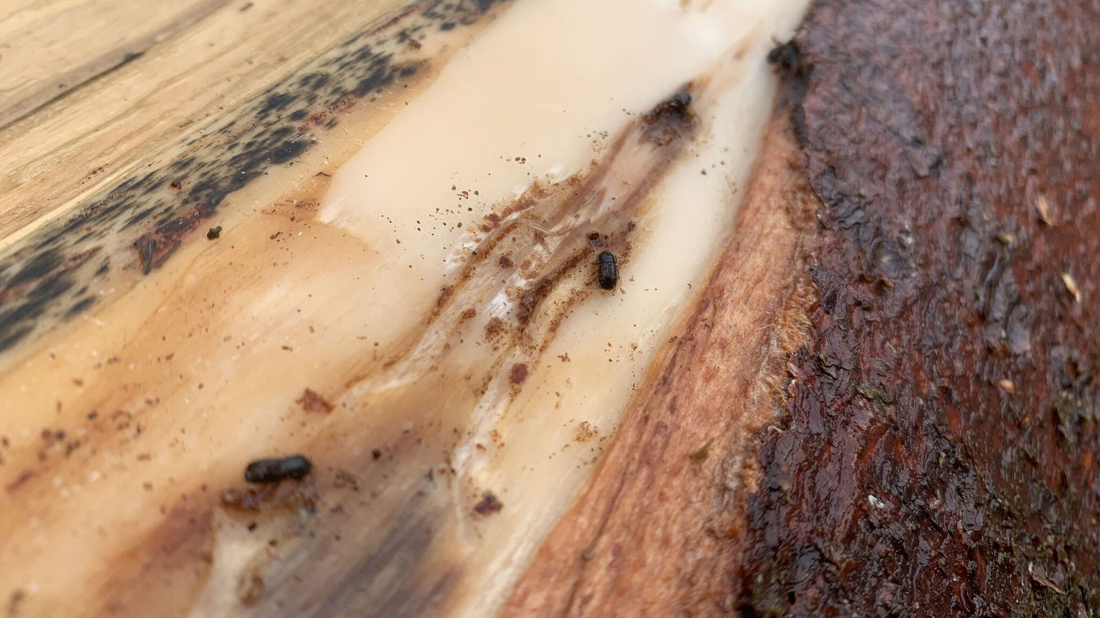 Unscheinbare schwarze Kugeln: Der Borkenkäfer hat auch diesen Fichtenstamm todbringend besiedelt. Foto: Rebekka Neander