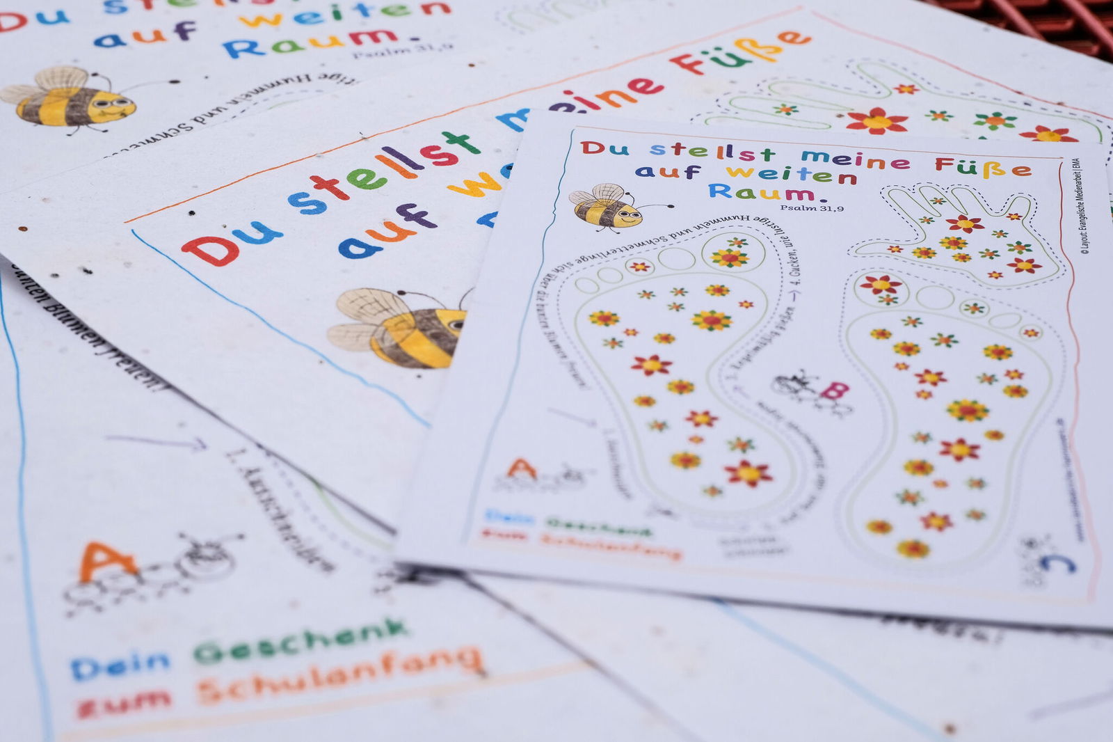 Zum Schulanfang verschenkt Landesbischof Ralf Meister in diesem Jahr Blumensamen an 45.000 die Erstklässlerinnen und Erstklässler in der Landeskirche Hannovers. Die Schülerinnen und Schüler bekommen in den Einschulungsgottesdiensten ein Samenpapier im DIN-A4-Format mit dem Motto der diesjährigen Aktion „Du stellst meine Füße auf weiten Raum“. Aus dem Papier lassen sich zwei Füße und eine Hand ausschneiden, die die Kinder in Erde einpflanzen können und aus denen dann Gänseblümchen wachsen.