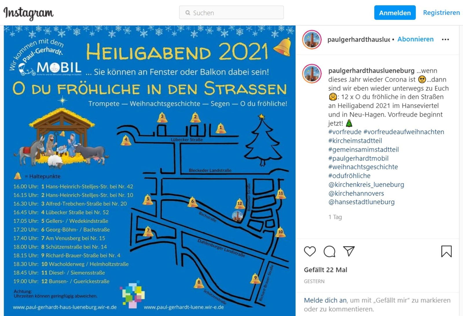 Auch in diesem Jahr ist an Heiligabend das Paul Gerhardt-Mobil wieder unterwegs. An 12 Stationen in den Stadtteilen Hanseviertel und Neu-Hagen wird es halten und Weihnachtsstimmung verbreiten: Weihnachtsgeschichte - Segen - O du fröhliche. Mit Abstand - am Fenster, auf dem Balkon oder vor der Tür - können Anwohnende dabei sein und die Weihnachtsbotschaft erleben.