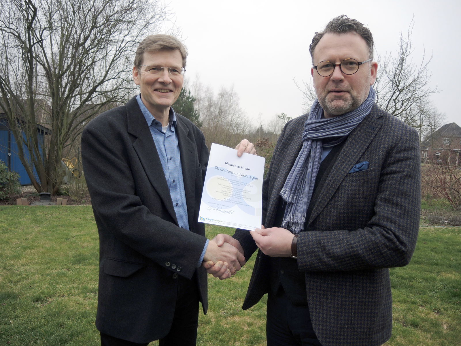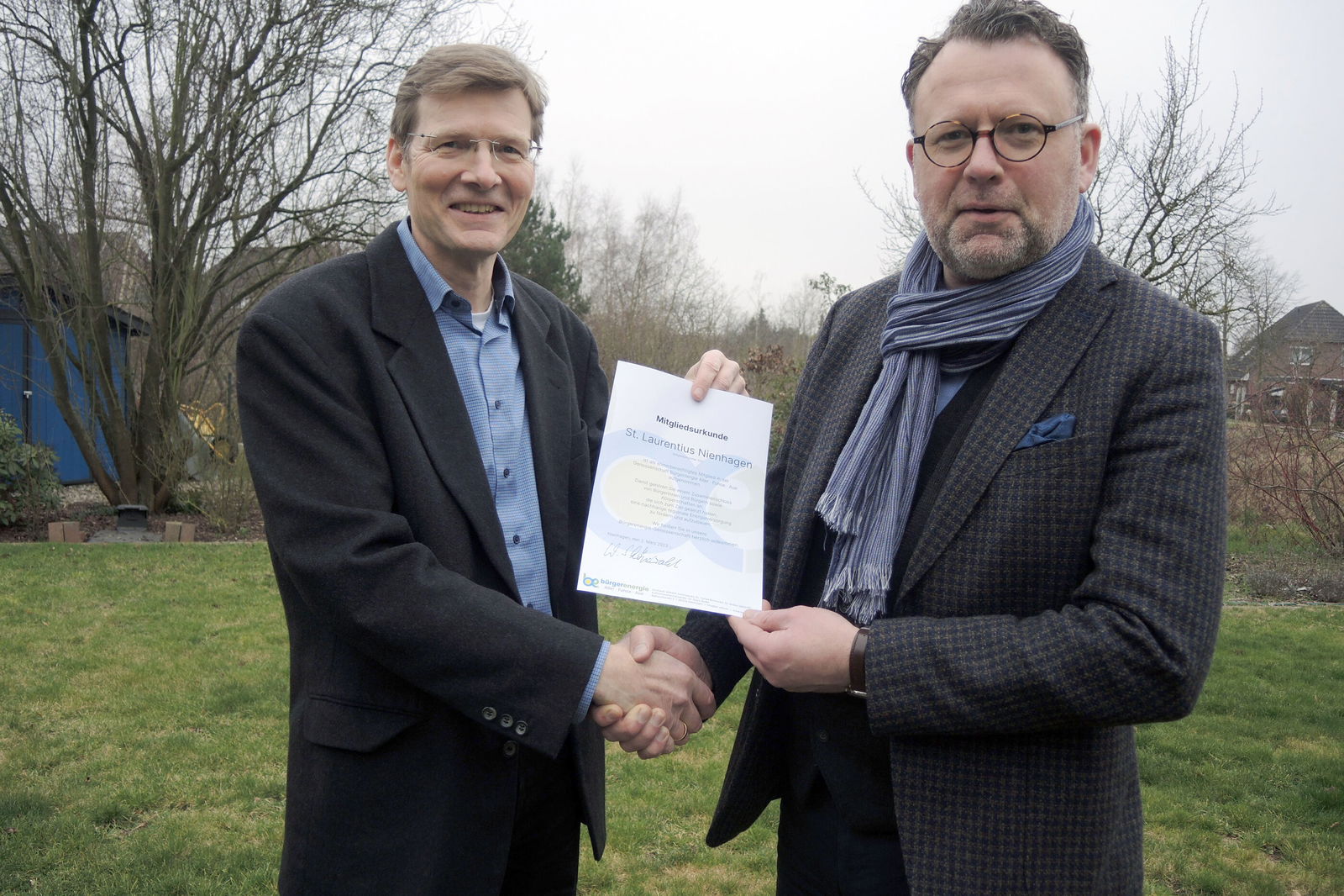 Die Freude war beidseitig: Kirchenvorstandsvorsitzender Harald Schilbock erhielt am 1. März aus den Händen von Wilhelm Schönewald, dem Vorstandsvorsitzenden der Bürgerenergie Aller-Fuhse-Aue eG, die Mitgliedsurkunde mit der Nummer 100 – und Wilhelm Schönewald konnte für die Energiegenossenschaft mit der Nienhagener Kirchengemeinde die erste Körperschaft begrüßen, die sich der Energiegenossenschaft angeschlossen hat.