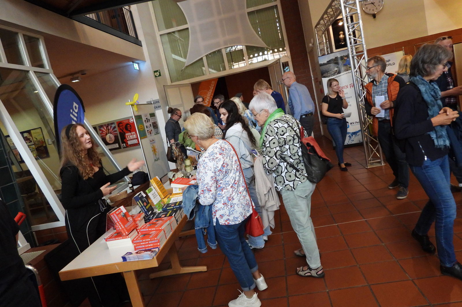 Vor und nach dem Vortrag gab es im Forum Gelegenheit, sich über die Arbeit verschiedener Vereine, Verbände und Initiativen zu informieren, darunter der NABU, die Biologische Arbeitsgemeinschaft, die Klimaschutzagentur, der ADFC, der Ökogarten, der Wasserverband, Gut Adolphshof, die Initiative gegen den Umbau des Kraftwerks Mehrum und die Klimaschutzagentur. Die Buchhandlung Thalia hatte einen Tisch mit aktuellen Werken des Referenten aufgebaut und der Weltladen lud zum Probieren fairer Produkte ein.