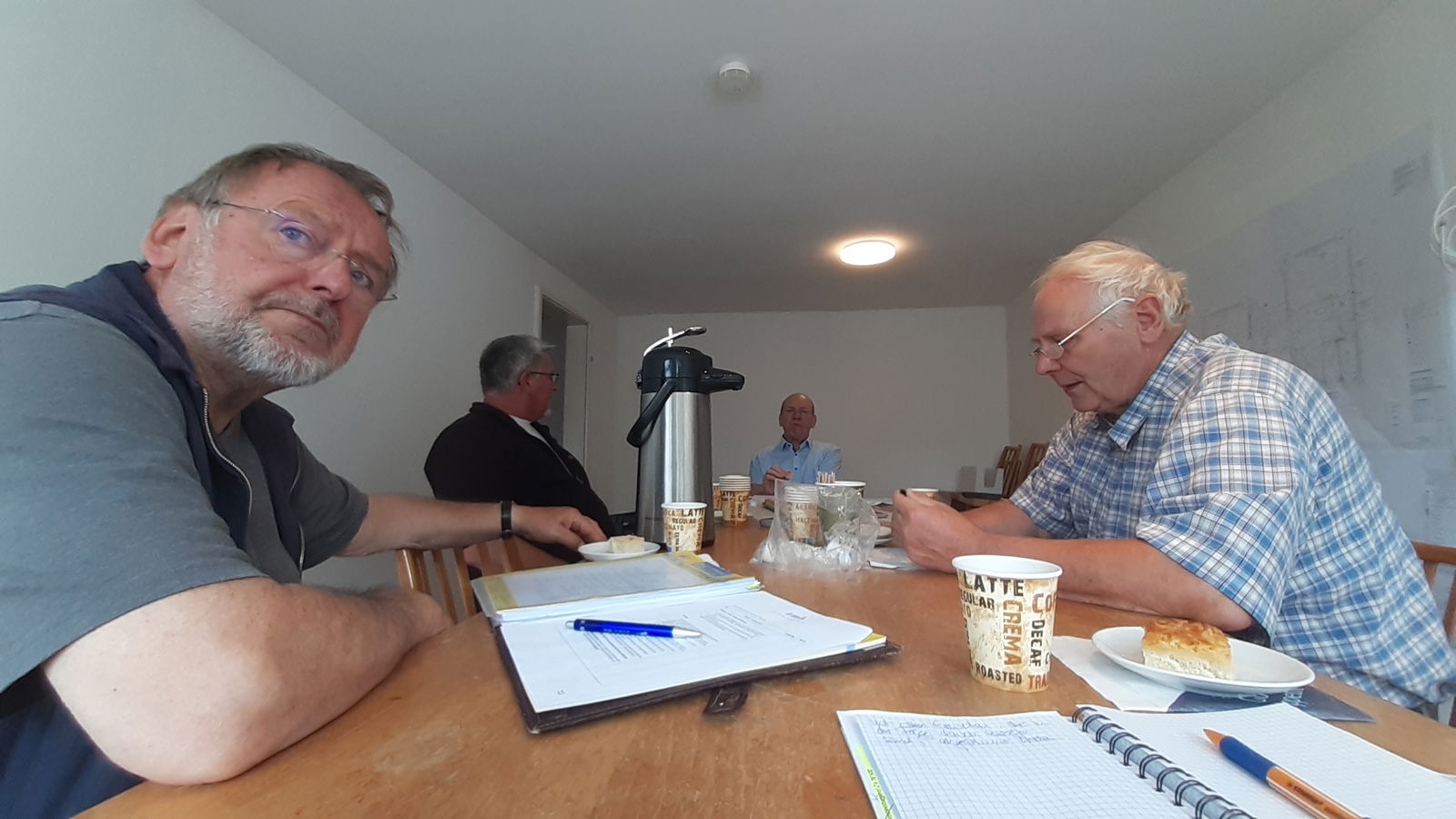 Vier Männer, zwei Stapel Pappbecher, eine Thermoskanne, ein Blech Butterkuchen, laute Stimmen, Ordner, Baupläne – hier geht es ziemlich handfest zu. „Das ist ja kein großes Hexenwerk, da müsst ihr den Sparren drei Zentimeter rübersetzen.“ Heinz Joachim Martens ist Architekt, der, der Bauten plant, nicht der, der sie eigenhändig baut. Dass er das Handwerk und seine unterschiedlichsten Gewerke aber sehr gut kennt, wird im Laufe der Baubesprechung zum Generationentreff DoerpHus immer wieder klar. „Hast Du Wendt noch Bescheid gesagt?“ „Nee, was soll der hier?! Das Holz ist bestellt, der kann jetzt eh‘ nix weitermachen.“ Man duzt sich, wir sind schließlich auf dem Dorf, es kennen sich alle untereinander. Springt zwischendrin ein Betrieb ab, hat der Architekt flugs Ersatz zu beschaffen. Dachdecker, Trockenbauer, Elektriker – es geht nur in der richtigen Reihenfolge und Hand-in-Hand.
