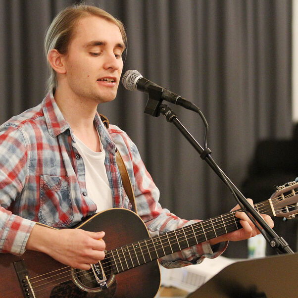 …an Marek Janietz. Der 23-Jährige studiert in Göttingen Evangelische Theologie und ist Teilnehmer des ersten C-Pop-Kurses der Landeskirche. Er nimmt zum ersten Mal an der Liederwerkstatt des Deutschen Evangelischen Kirchentags teil, bei der rund 30 Kreative neue Lieder für den Kirchentag in Hannover 2025 schreiben.