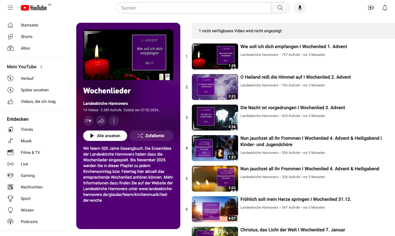 Die Landeskirche Hannovers rückt jetzt mit einer neuen musikalischen Aktion das Wochenlied in den Fokus. Seit dem ersten Adventssonntag 2023, dem Beginn des neuen Kirchenjahres, gibt es das Format Wochenlied. Jeden Sonntag wird ein altes Lied veröffentlicht, neu vertont von den Ensembles der 140 hauptberuflichen Kirchenmusikerinnen und Kirchenmusiker der Landeskirche. So wächst nach und nach ein Potpourri der Kirchenmusik auf dem Youtube-Kanal und zeigt die Vielfalt und das Können der Chöre und Musiker der Landeskirche.