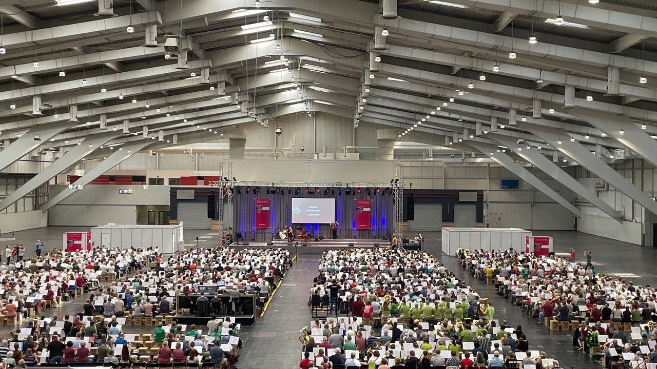 Für alle, die eine kurze Pause in einer angenehm klimatisierten Halle mit ausreichend Sitzmöglichkeiten benötigen: Kommen Sie in Halle 7 auf dem Messegelände. Hunderte von Blechbläsern haben die riesige Halle in ihren Probenraum umgewandelt. Das, was ich hier gerade erleben darf, würde ich gern in Worte fassen – es ist mir aber beim besten Willen nicht möglich! Also: Machen sie einen kurzen Abstecher in Halle 7.