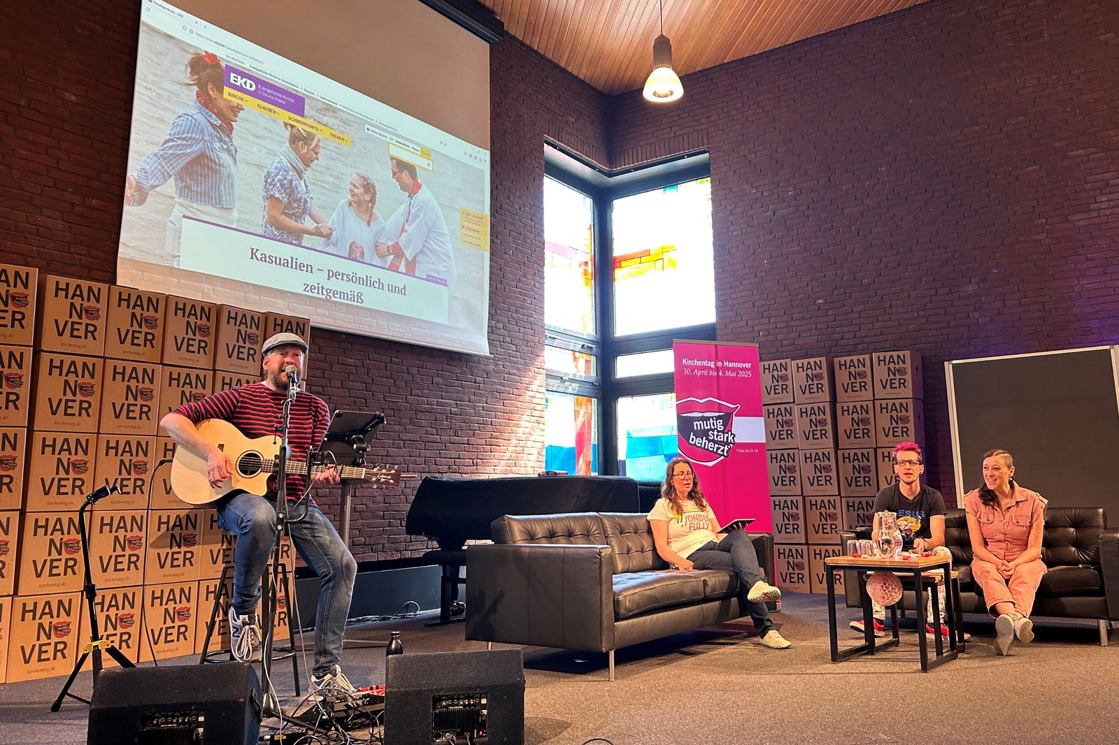 Diese und andere Fragen diskutierten die Besucherinnen und Besucher unter der erfrischenden Moderation von Pastor Max Bode und Entertainerin Annie Heger, für Musik sorgte Jan Keßler. Der Gitarrist gehört zum Team der Hamburger Wohnzimmerkirche und der Agentur St. Moment. Sein Appell: Kirchliche Feiern sollten unbedingt in multiprofessionellen Teams geplant werden. Bei Traugesprächen ist er als Musiker dabei und spielt den Paaren mögliche Lieder vor. Und auch die Küsterinnen und Küster sollten von Anfang an einbezogen werden. „Denn die achten nochmal auf ganz andere Sachen.“