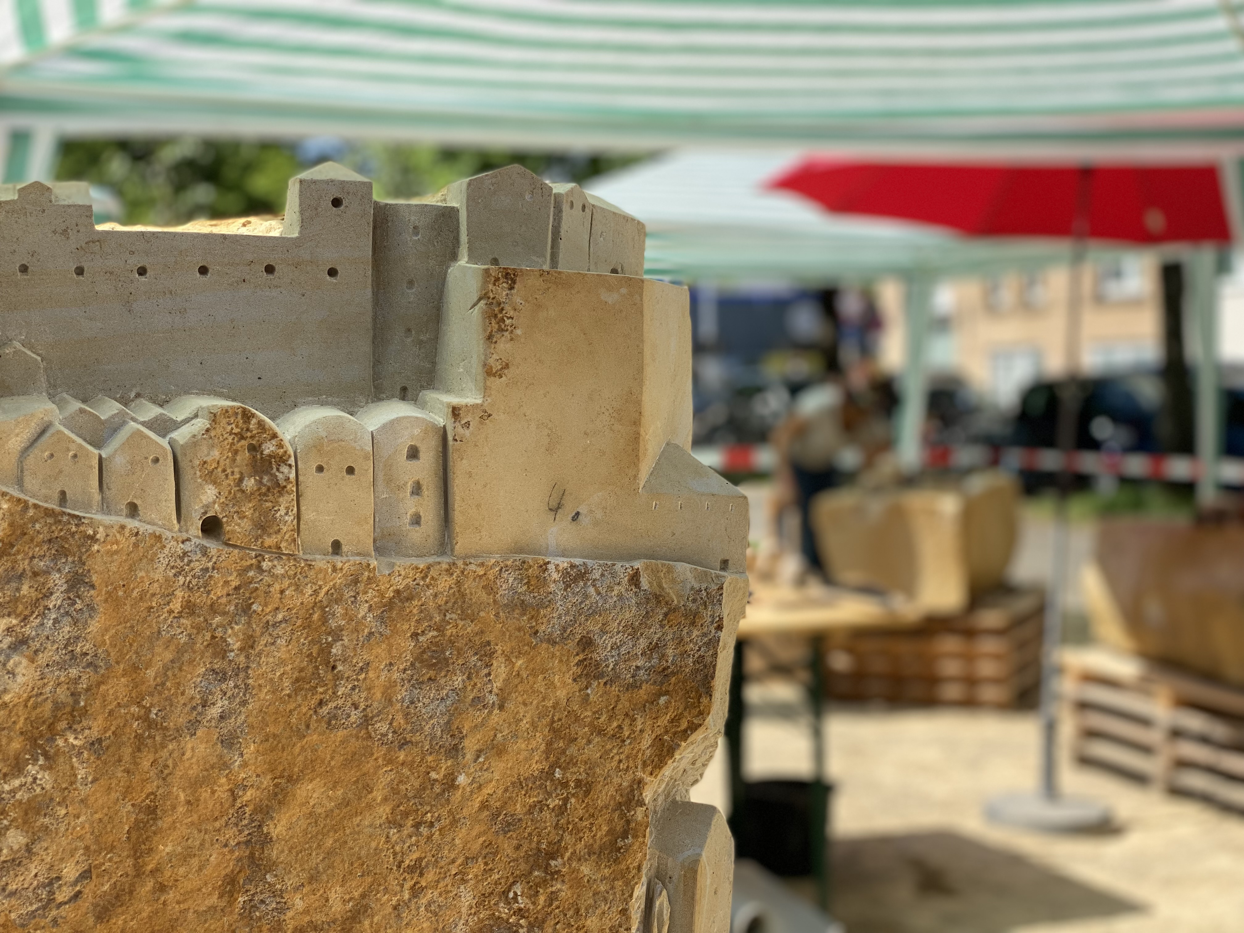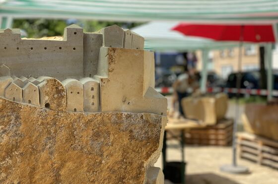 Nächster Stop: Das Haus der Religionen. Hier entsteht während des Kirchentags ein Garten der besonderen Art. Durch die Anleitung von einem Steinmetz nehmen die acht Sandsteinblöcke nach und nach die Form einer Friedensstadt an. So wird es auch über den Kirchentag hinaus einen einzigartigen Ort vor dem Haus der Religionen geben, der an diese Zeit erinnert. Dass der Kirchentag in seiner gastgebenden Stadt etwas dauerhaft hinterlässt, ist eine Premiere. Für Hannover als Geburtsstadt des Kirchentag durchaus passend.