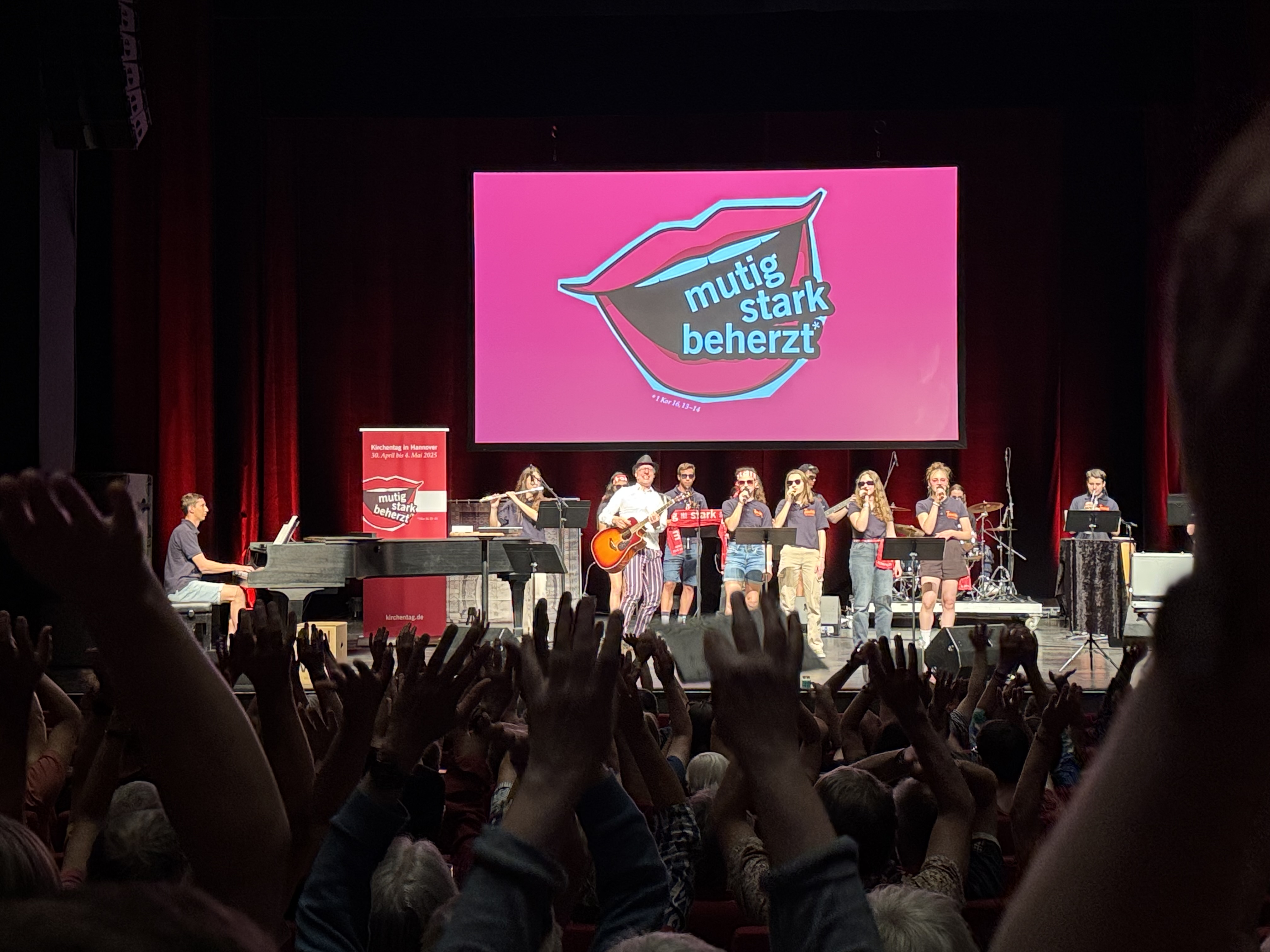 Kabarett gehört irgendwie auch mit zum Kirchentag dazu. Genauso wie ein selbstironisches Publikum, das sich in den Texten des „Duo Camillo“ absolut wiederfindet. Das Theater am Aegi ist bis auf den letzten Platz gefüllt (die großartigen Helfenden finden auch für alle einen Platz). Immerhin riechen wir laut Künstler Fabian Vogt heute am Donnerstag – trotz der leidigen Zustände in den Massenunterkünften – noch nicht ganz so schlecht wie das Publikum an den nächsten beiden Tagen! Dermaßen motiviert singen wir tat- und taktkräftig mit oder werfen nach Aufforderung Stichworte (und Kugelschreiber) auf die Bühne. Hieraus entsteht spontan das Lied der Kirche von morgen: Man wünscht sich neben Teebeutelweitwurf ganz besonders den Halbliter-Becher beim Abendmahl, was Künstler Martin Schultheiß gleichermaßen irritiert und erheitert.