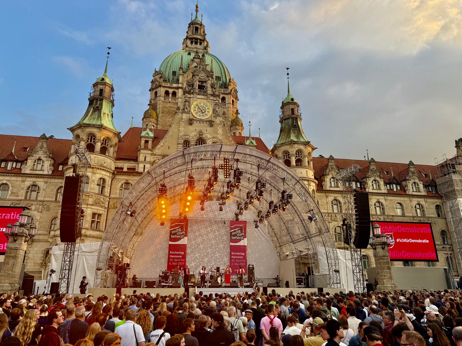 "Heute hat der Verfassungsschutz die AfD als gesichert rechtsextrem eingeordnet - es war höchste Zeit", rief die Präsidentin des Kirchentags, Anja Siegesmund, dem Publikum zu, das ihre letzten Worte in tosendem Applaus untergehen ließ. "Gegen Hass und Hetze muss der Rechtsstaat wehrhaft sein. Die Einschätzung des Verfassungsschutzes war dafür ein deutliches Signal. Kirchentag, die Stadt Hannover, die Landeskirche Hannovers und alle Unterstützenden stehen für Vielfalt, Offenheit und unsere demokratische Gemeinschaft."