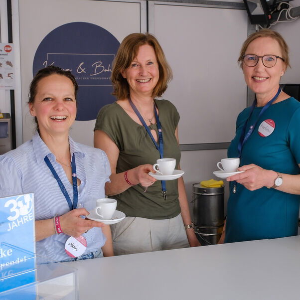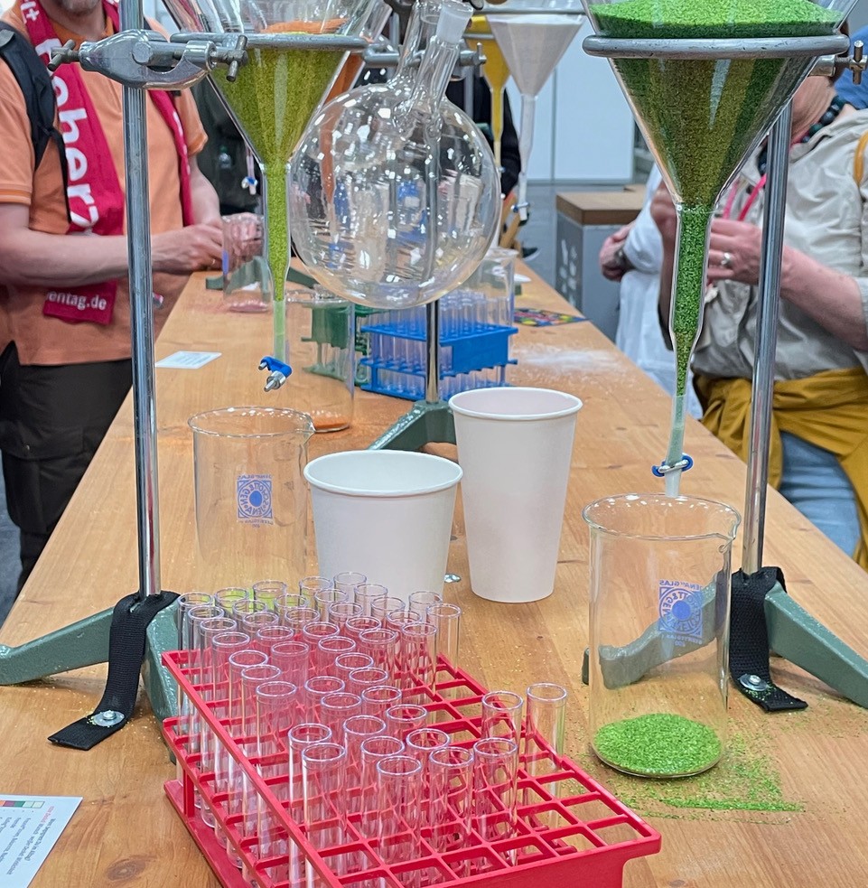 Es ist interessant zu beobachten, wie unterschiedlich sich die Gläser der Kirchentagsbesuchenden füllen und färben. Und auch die Leute vergleichen, sie erzählen und hören zu, diskutieren und lachen, werden nachdenklich. Wir sollen ein zweites Reagenzglas abfüllen: wie WÜNSCHEN wir uns unser Leben?
