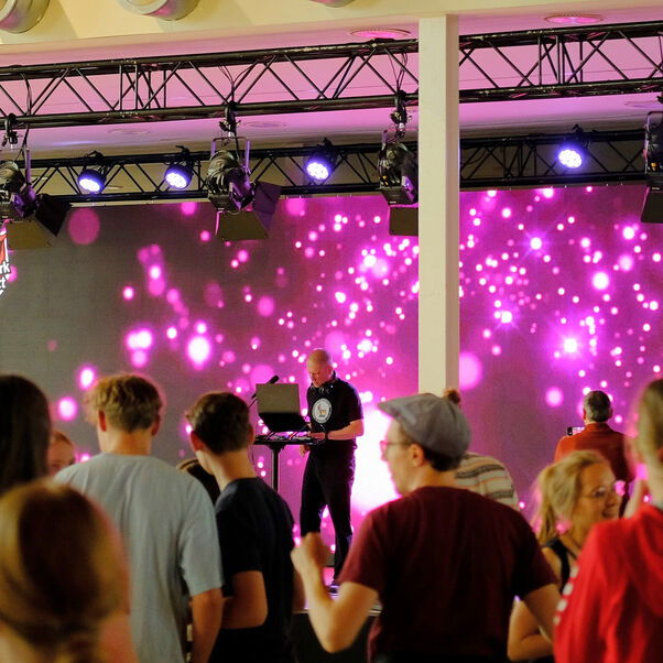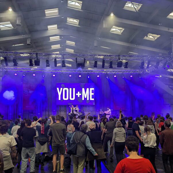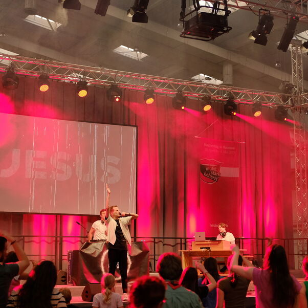 Fans elektronischer Musik kamen am Samstag auf dem Messegelände voll auf ihre Kosten. Unter dem Motto „Electric Sunday on a Saturday“ startete am späten Nachmittag in Pavillion 35 ein Gottesdienst mit großer Tanzfläche. „Es ist eure Pause vor Gott, es ist eure Zeit. Ihr dürft sie verbringen, wie es euch gut tut“, begrüßt uns der DJ vor einer riesigen Leinwand mit sphärischen Videoanimationen. Sitzen, tanzen, stehen, alles sei erlaubt. Doch auf den Papphockern hielt es nur wenige. Pulsierende Beats und ein wummernder Bass pusten die anfängliche Zurückhaltung schnell weg und schon nach wenigen Minuten bilden sich überall im Raum tanzende Grüppchen. Der elektronische Tanzgottesdienst ist ein Angebot von „Himmlische Höfe“ Berlin, dem kirchlichen Campus von Evangelischer Studierendengemeinde, Studienkonvikt und Kirchengemeinde. Normalerweise finden die Electro-Gottesdienste in der dortigen Kirche statt.
